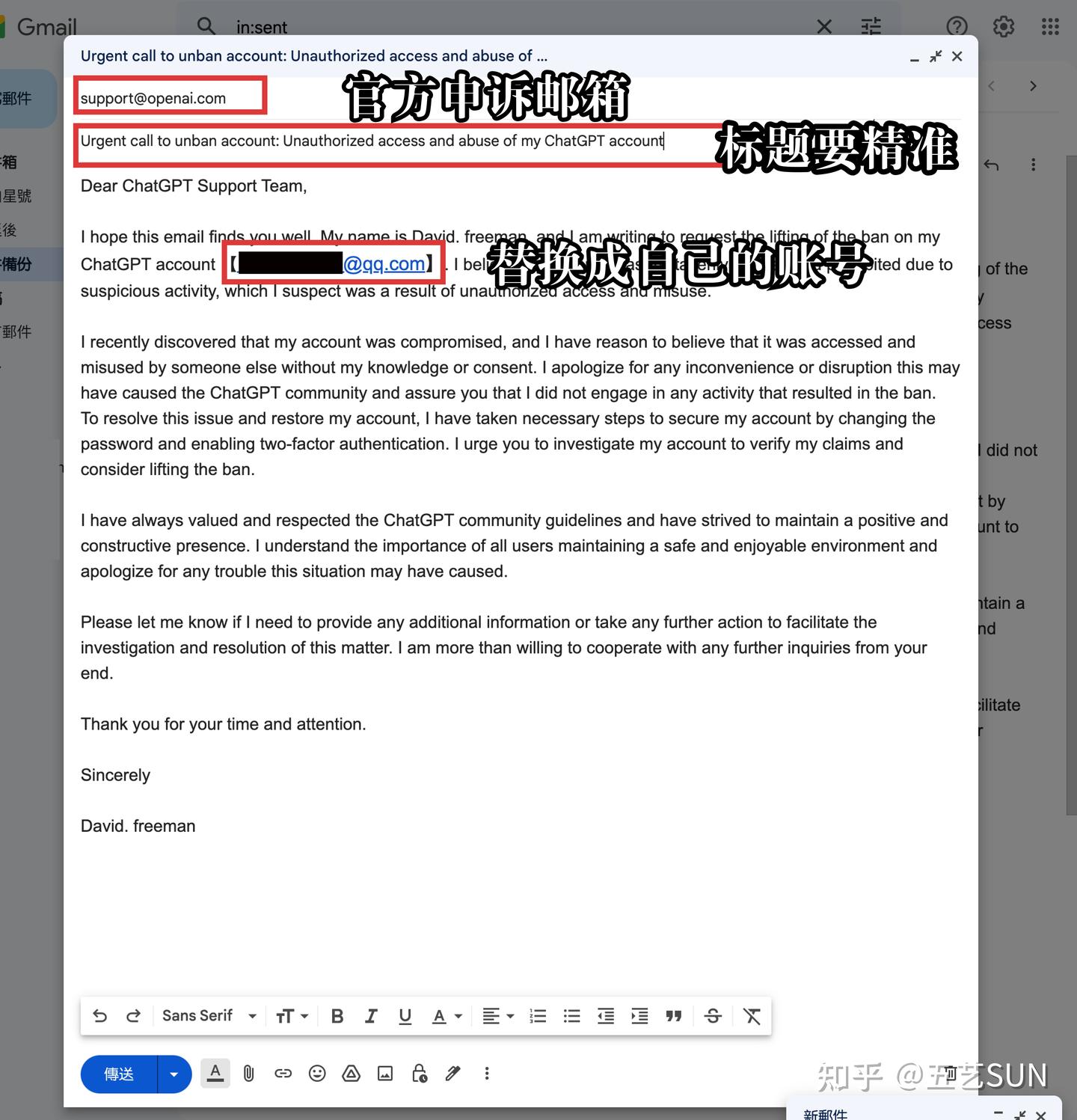 - I am writing to you in hopes that you receive this email. My name i [你的名字], and I am writing to appeal the ban on my ChatGPT account(用户名:[你的邮箱名字]). I believe my account has been wrongly flagged and banned due to suspicious activity, and I suspect this is the result of unauthorized access and misuse.