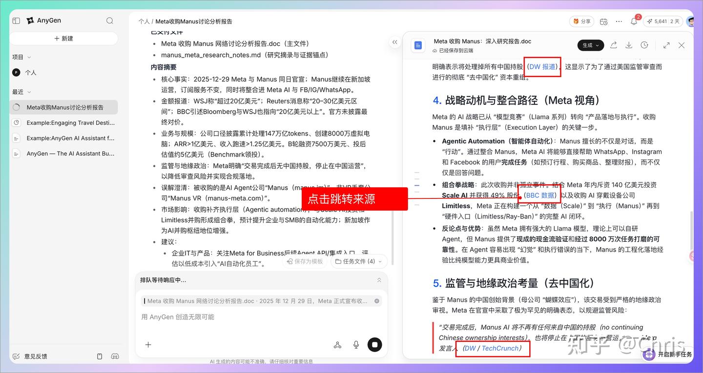 使用 AI 制作一些报告的时候,最担心的是 AI 会胡编乱造,而 AnyGen 生成的报告内容中,支持显示内容的来源,做到内容真正可溯源,避免 AI 胡编乱造导致内容不可信,点击内容后面蓝色链接,即可跳转到来源页面: