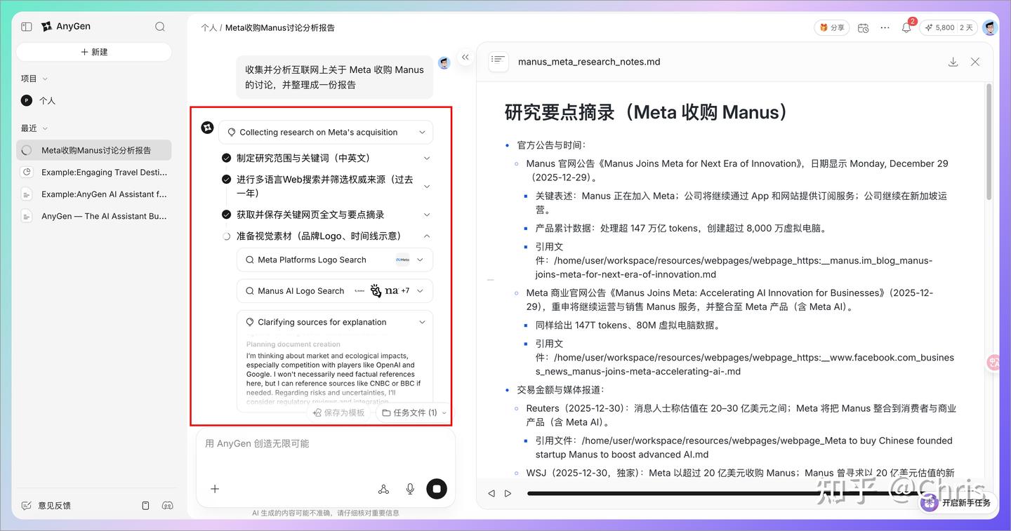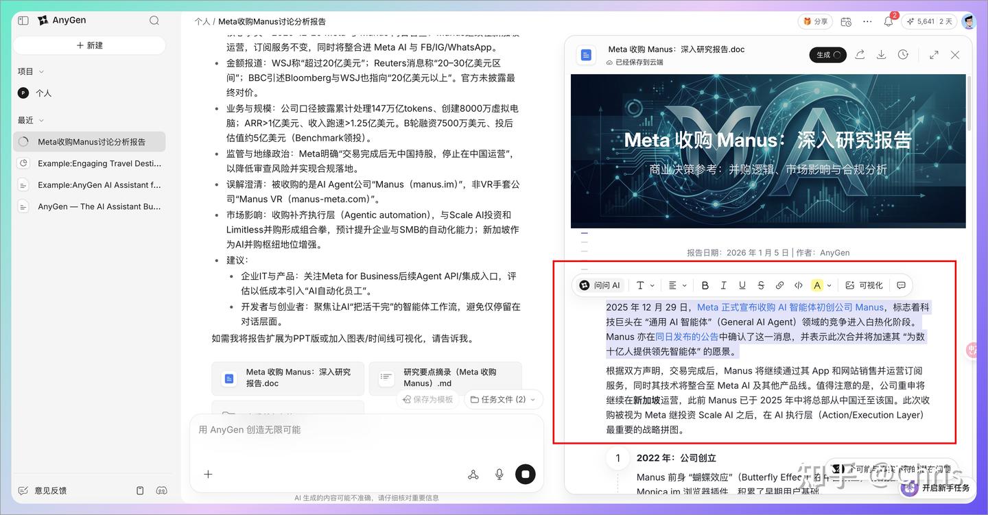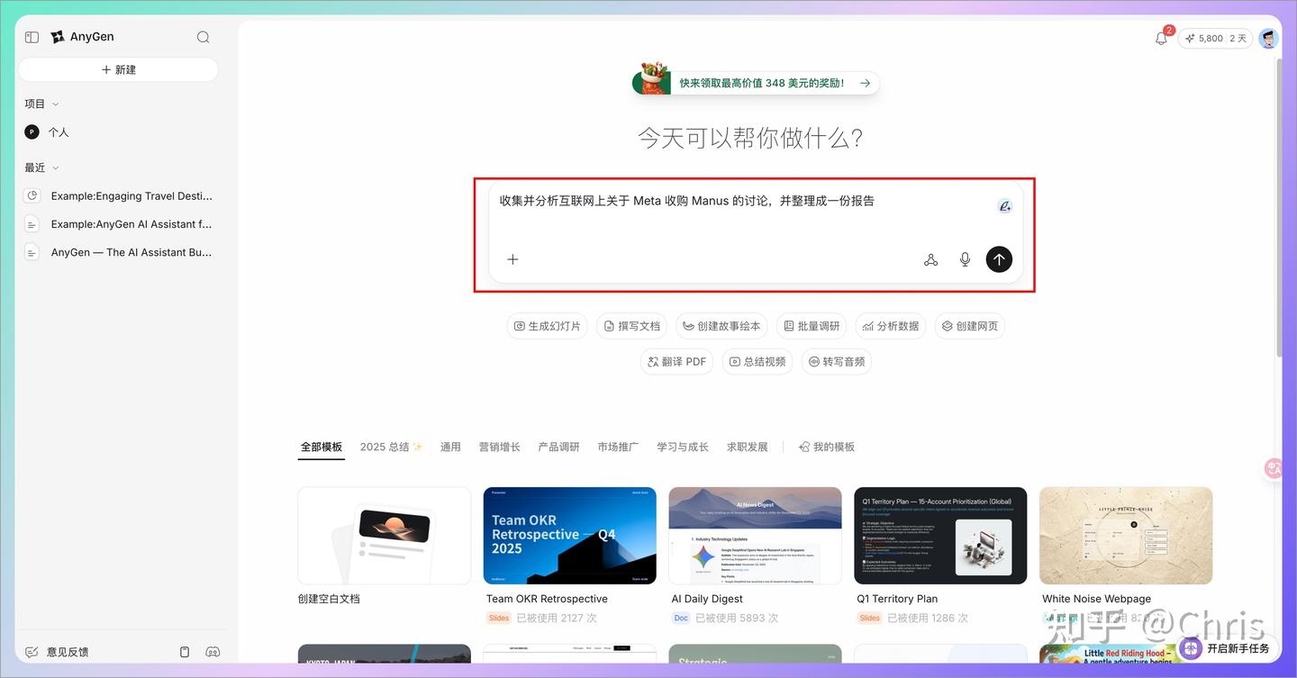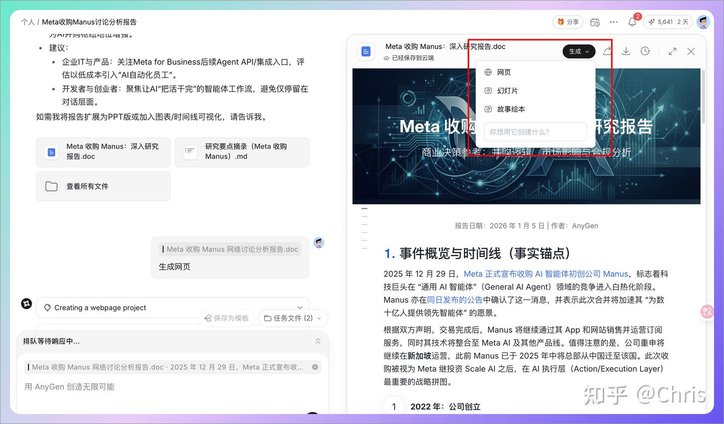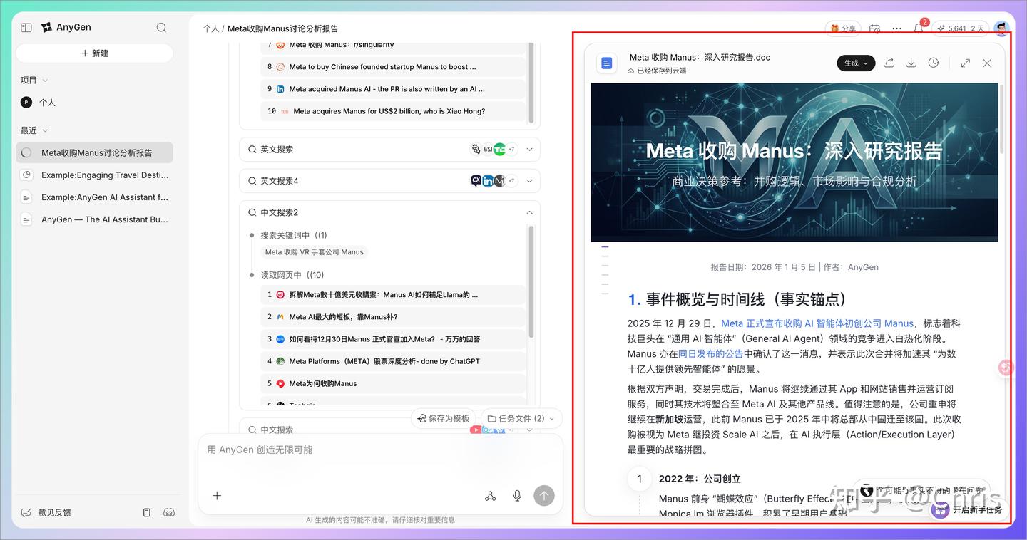 接下来一起体验一下 AnyGen,Chris 针对最近 Manus 事件,让 AnyGen 做一个测试,任务为: