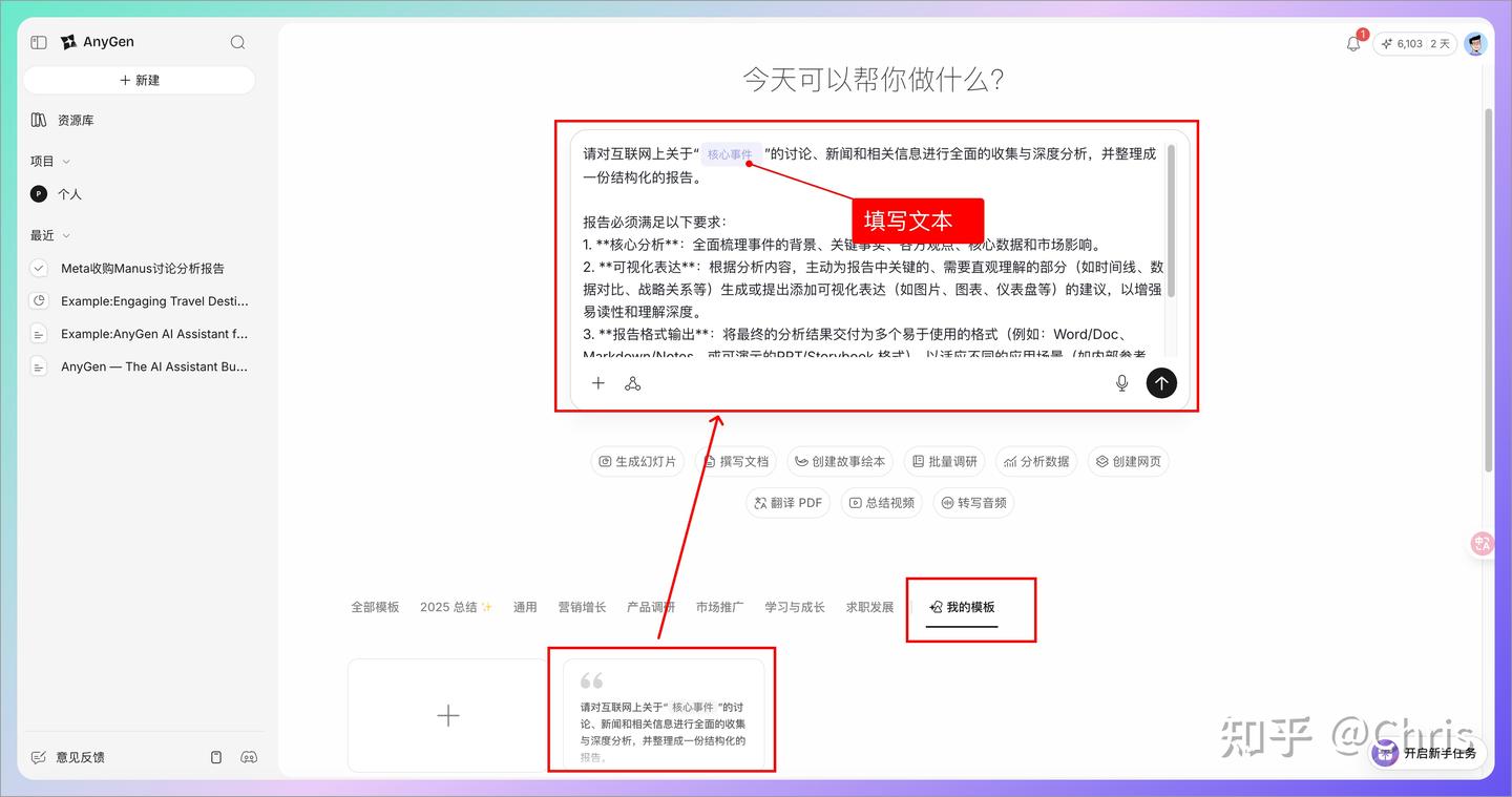 使用时,在首页点击“我的模板”,然后点击需要使用的模板,就可以把模板的提示词添加到输入框中,这时候只需要补充文本占位符的内容即可快速复用: